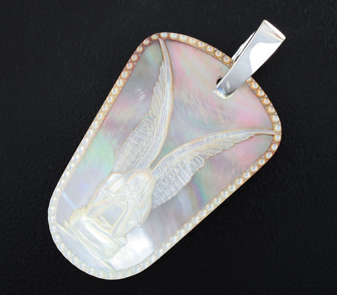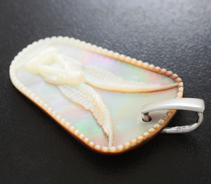 Вашему вниманию предлагается замечательный образец камнерезного искусства – камея «Ангел» с петлей из белого золота 585 пробы и резного перламутра! Ручная работа! Не подвергалась окрашиванию. Размеры с петлей 43 х 24 х 3 мм. Вес 3,6 г.