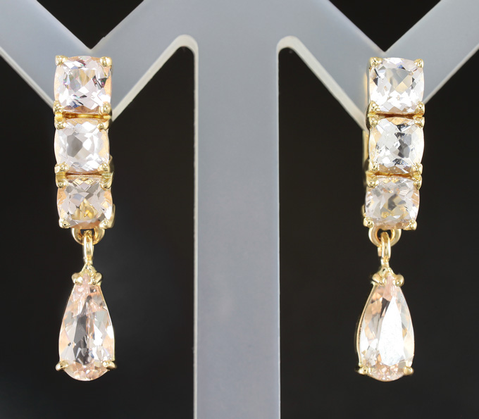 Вашему вниманию предлагаются серьги из желтого золота 585 пробы с морганитами! Размеры серег с петлей 31 х 5 мм. Вес пары 5,7 г. Ниже приводятся ювелирные характеристики вставок.
