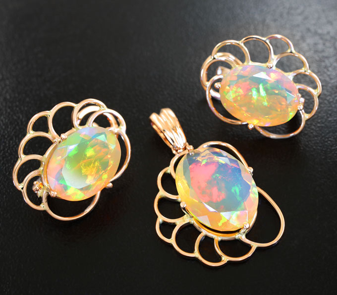 Вашему вниманию предлагается комплект (серьги + кулон) из желтого золота 585 пробы с ограненными эфиопскими опалами! Вес комплекта 9,9 г.