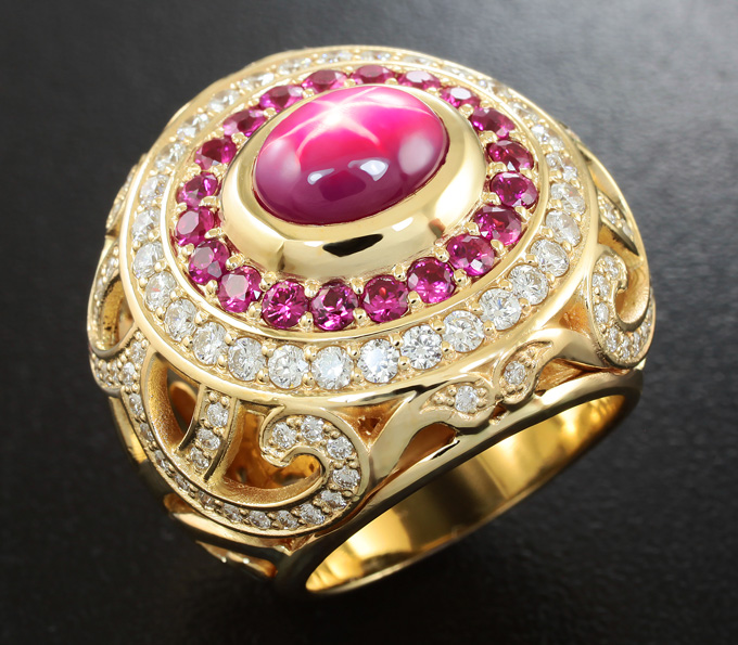 Кольцо со звездчатым рубином, ограненными рубинами и бриллиантами