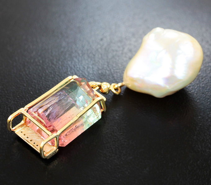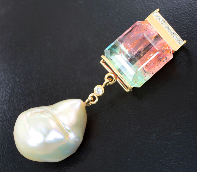 Кулон с крупным «арбузным» турмалином, жемчужиной барокко и бриллиантами