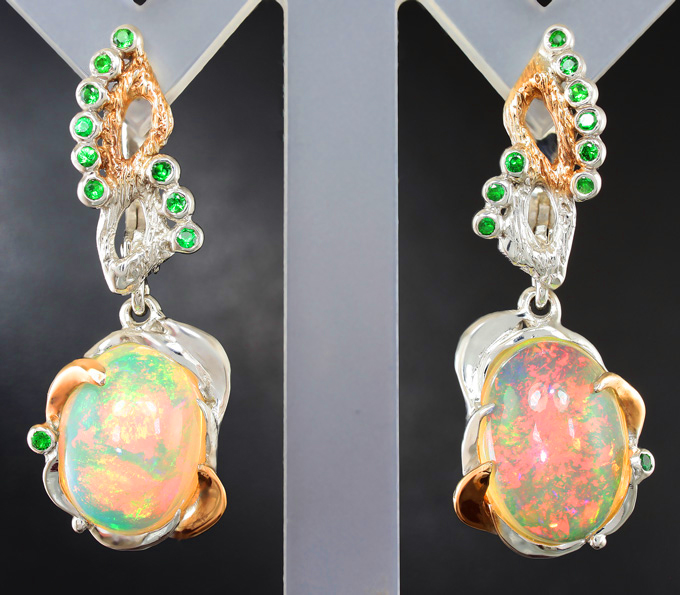Серьги с кристаллическими эфиопскими опалами и цаворитами гранатами