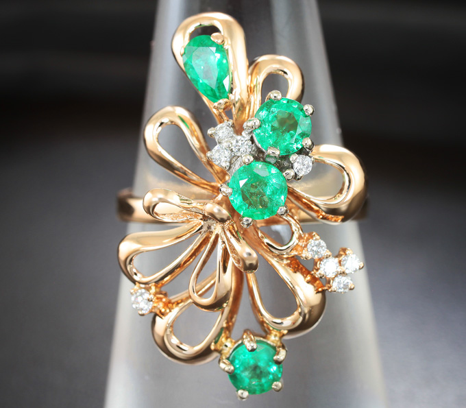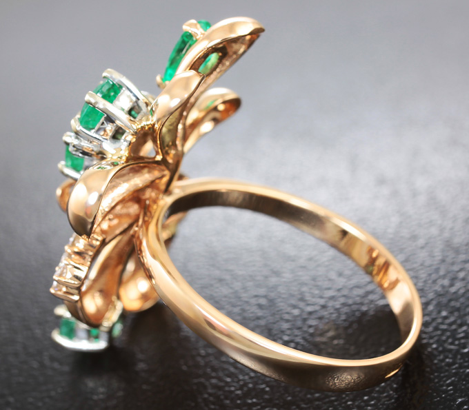 Вашему вниманию предлагается кольцо из красного золота 585 пробы c изумрудами и бриллиантами! Размеры изумрудов от 3,7 мм до 5 х 3,1 мм, диаметр бриллиантов 1,35 мм и 1,6 мм. Площадка 26 х 17 мм, высота 8 мм. Вес изделия 4,8 г. Размер 17.