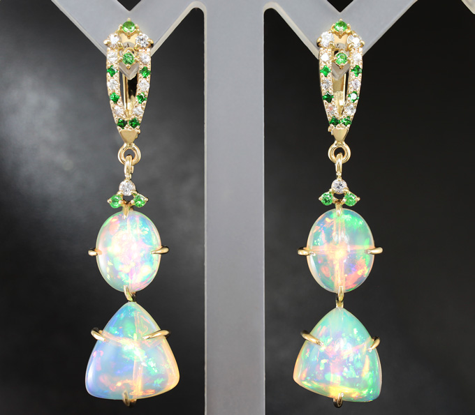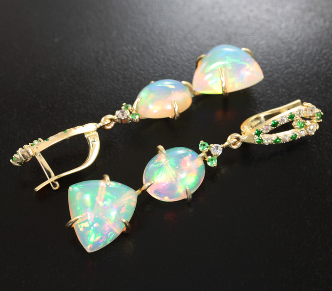 Серьги с кристаллическими эфиопскими опалами, цаворитами гранатами и бесцветными цирконами