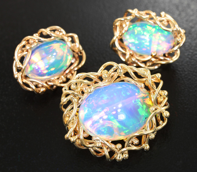 Вашему вниманию предлагается комплект (серьги + брошь/кулон) из желтого золота 585 пробы с кристаллическими эфиопскими опалами 12,42 карата! Основные цвета опалесценции: красный, желтый, зеленый и синий. Размеры вставок 12 х 8 мм. Вес комплекта 11,6 г.