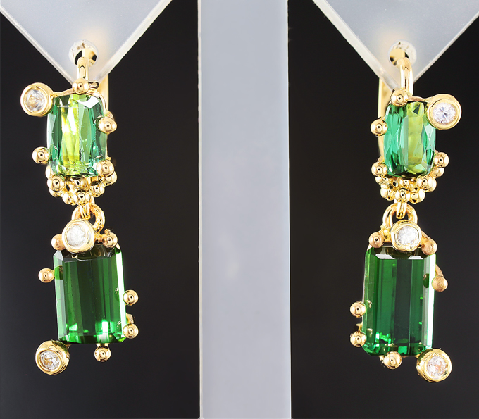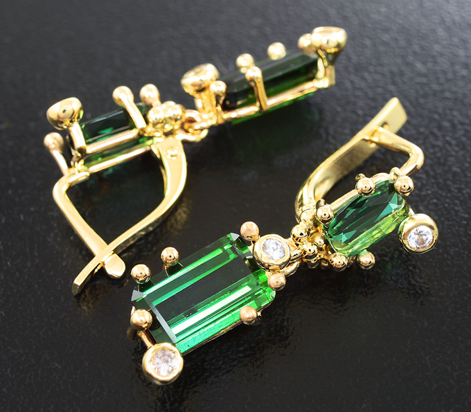 Вашему вниманию предлагаются серьги из желтого золота 585 пробы с турмалинами 5,76 карата и лейкосапфирами! Размеры вставок от 2 мм до 10 х 6 мм. Размеры серег с петлей 29 х 17 мм. Вес пары 5,2 г.