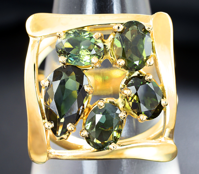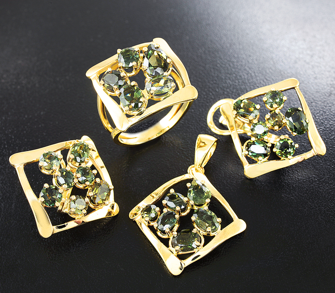 Вашему вниманию предлагается комплект (кольцо + серьги + кулон) из желтого золота 585 пробы с корнерупинами 10,76 карата! Размеры вставок от 3,5 мм до 9 х 5 мм. Вес комплекта 18,8 г.