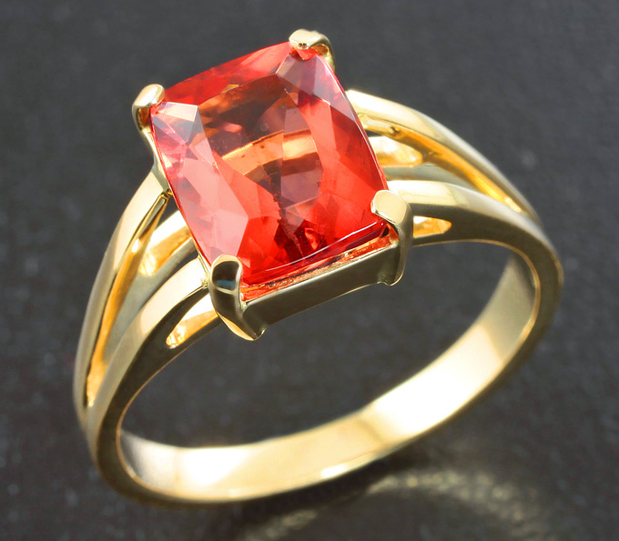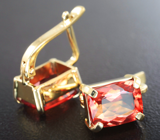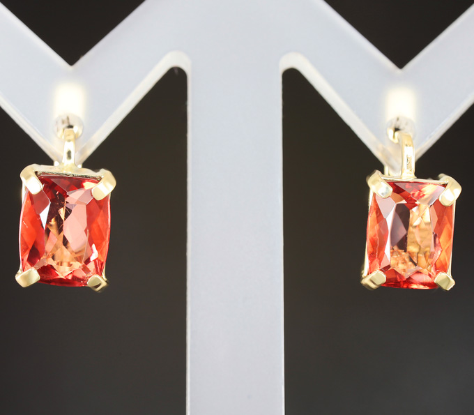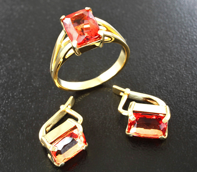 Вашему вниманию предлагается комплект (кольцо + серьги) из желтого золота 585 пробы с флюоритами падпарджа! Вес комплекта 7,4 г.