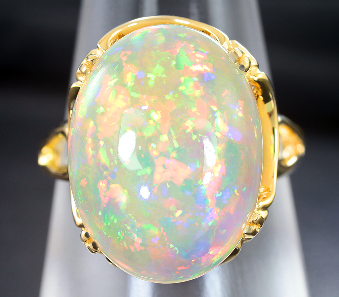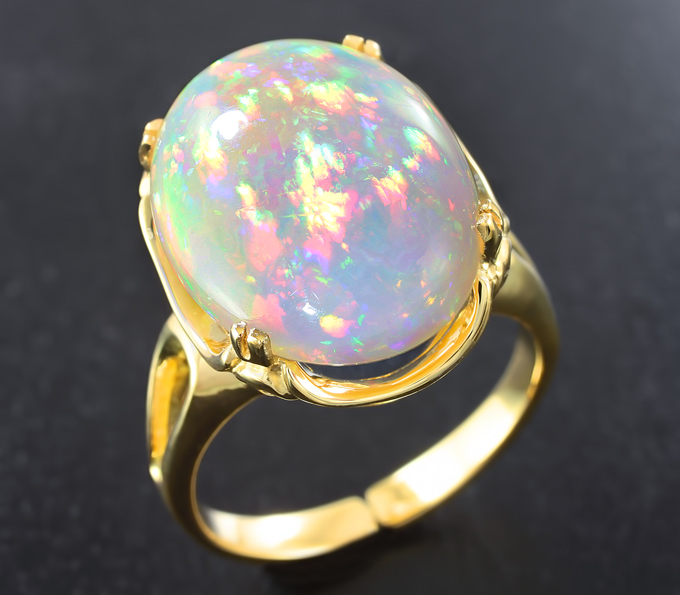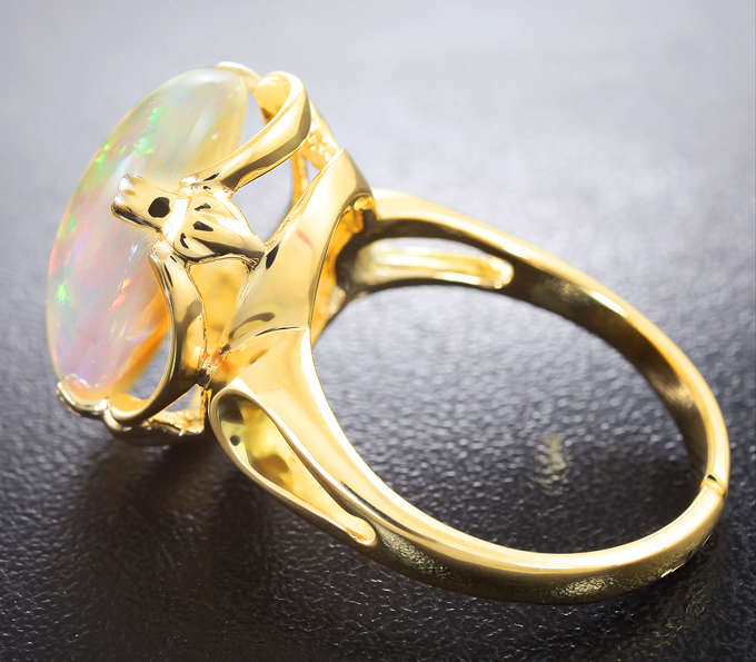 Вашему вниманию предлагается кольцо из желтого золота 585 пробы с кристаллическим эфиопским опалом! Основные цвета опалесценции: красный, желтый, зеленый и фиолетовый. Площадка 19 х 16 мм, высота 12 мм. Вес изделия 7,8 г. Размер регулируемый: 19 и выше. Ниже приводятся ювелирные характеристики вставки.