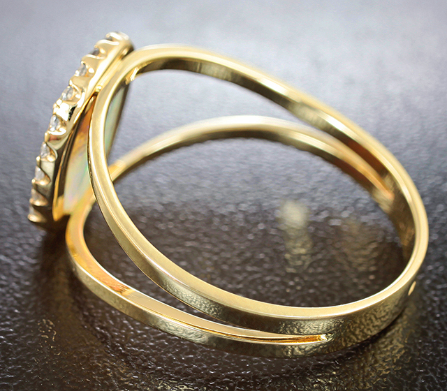 Вашему вниманию предлагается кольцо из желтого золота 585 пробы c австралийским solid опалом и бесцветными цирконами! Диаметр дополнительной инкрустации 1,5 мм. Основные цвета опалесценции: зеленый, синий и фиолетовый. Размеры вставок от 1 мм до 10 х 8 мм. Площадка 13 х 11 мм, высота 3 мм. Вес изделия 3,3 г. Размер 20. Ниже приводятся ювелирные характеристики опала.