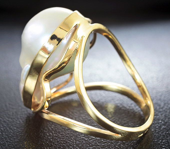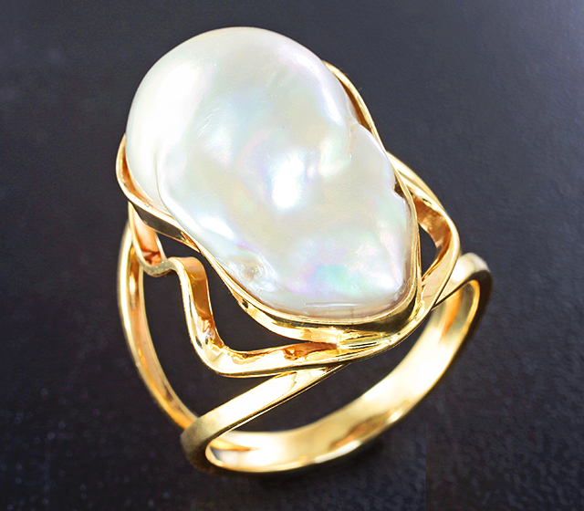 Вашему вниманию предлагается кольцо из желтого золота 585 пробы с жемчужиной барокко! Размеры вставки 22 х 13 мм. Площадка 23 х 15 мм, высота 13 мм. Вес изделия 9,1 г. Размер 18,25.