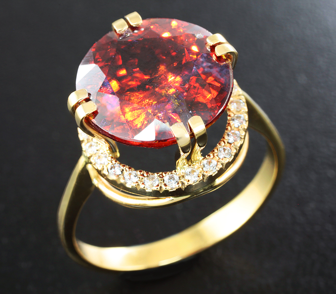 Вашему вниманию предлагается кольцо из желтого золота 585 пробы с крупным сфалеритом и бесцветными цирконами! Диаметр дополнительной инкрустации 1 мм и 1,1 мм. Площадка 13 х 13 мм, высота 8 мм. Вес изделия 4,2 г. Размер 16,75. Ниже приводятся ювелирные характеристики сфалерита.