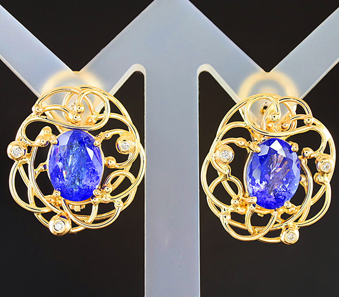 Вашему вниманию предлагаются серьги из желтого золота 585 пробы с танзанитами 5,95 карат и бриллиантами! Размеры вставок 1,3 мм и 10 х 7 мм. Площадка серег 21 х 19 мм. Вес пары 8,5 г.