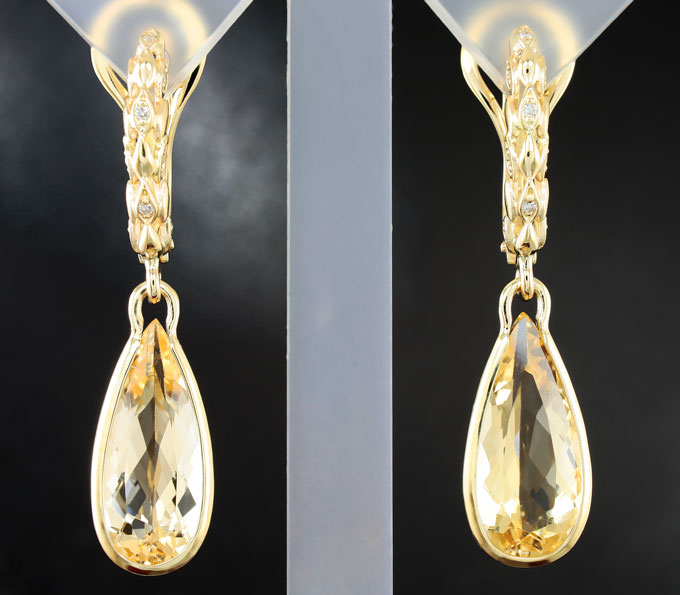 Вашему вниманию предлагаются серьги из желтого золота 585 пробы с гелиодорами и бриллиантами! Размеры серег с петлей 41 х 10 мм. Вес пары 6,5 г. Ниже приводятся ювелирные характеристики вставки.