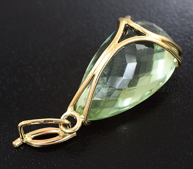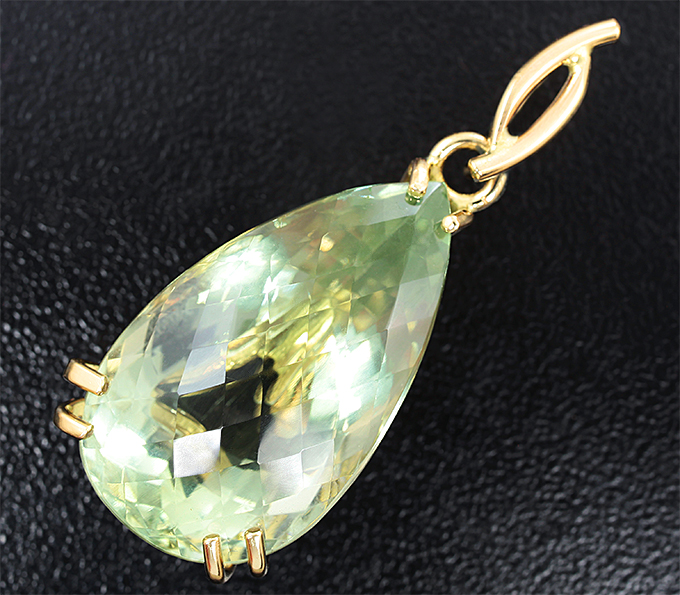 Вашему вниманию предлагается кулон из желтого золота 585 пробы с чистейшим зеленым аметистом! Размеры кулона с петлей 39 х 16 мм. Вес изделия 6,9 г. Ниже приводятся ювелирные характеристики вставки.