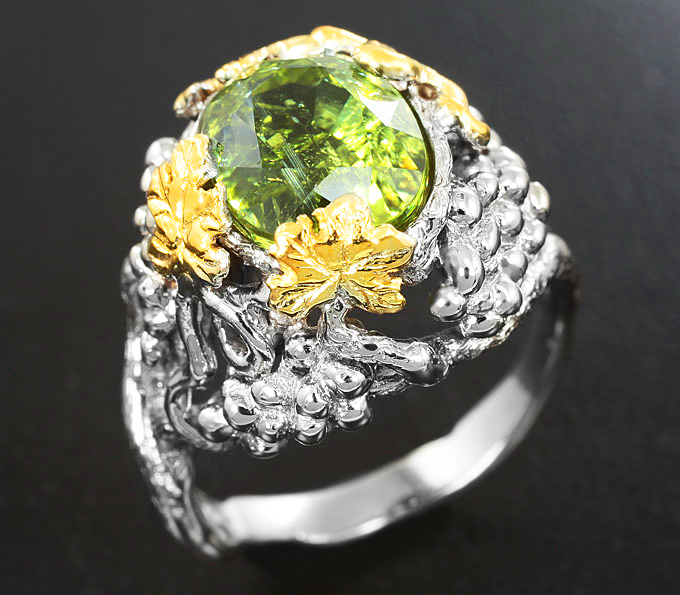 Вашему вниманию предлагается кольцо из белого и желтого золота 585 пробы c желто-зеленым турмалином! Изделие с частичным чернением. Площадка 17 х 16 мм, высота 9 мм. Вес изделия 6,6 г. Размер 17. Ниже приводятся ювелирные характеристики вставки.