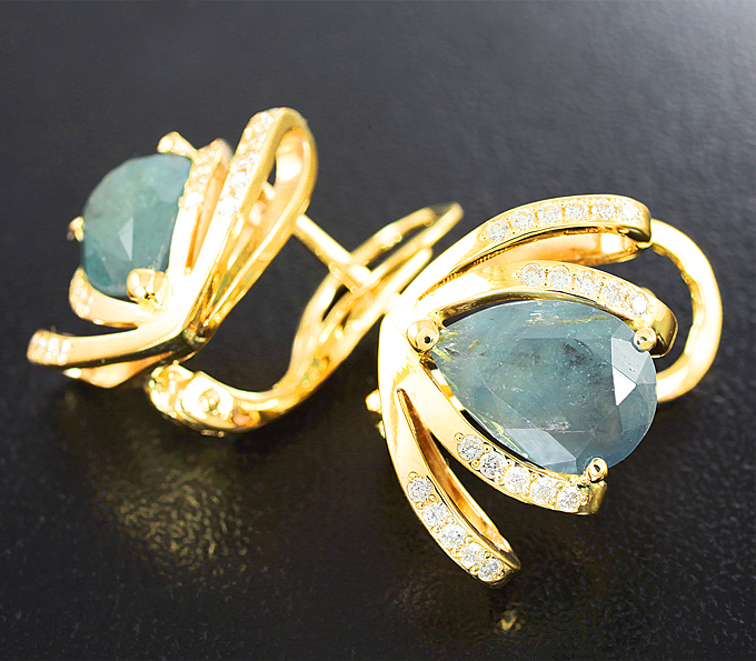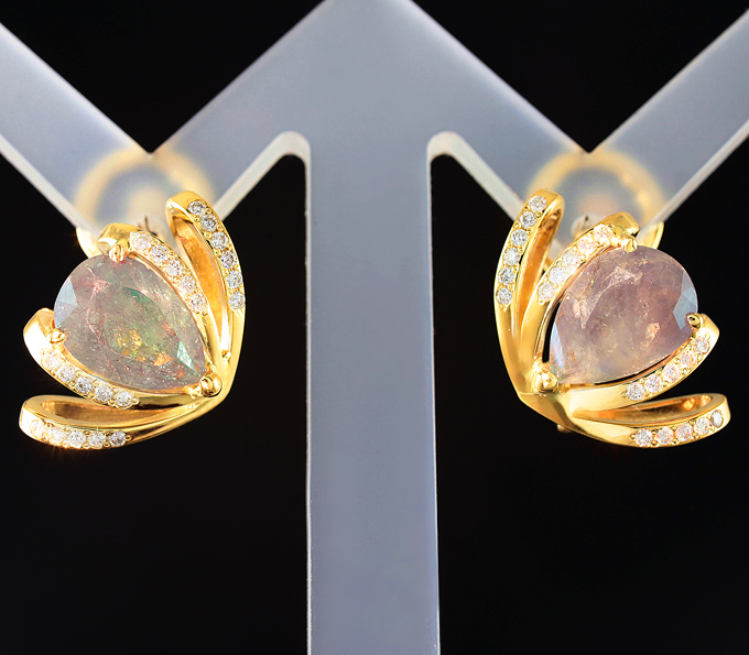 Вашему вниманию предлагаются серьги из желтого золота 585 пробы с уральскими александритами и бриллиантами! При смене освещения александриты приобретают розовый нацвет. Диаметр дополнительной инкрустации 1,1 мм. Площадка серег 17 х 12 мм. Вес пары 6,2 г. Ниже приводятся ювелирные характеристики александритов.