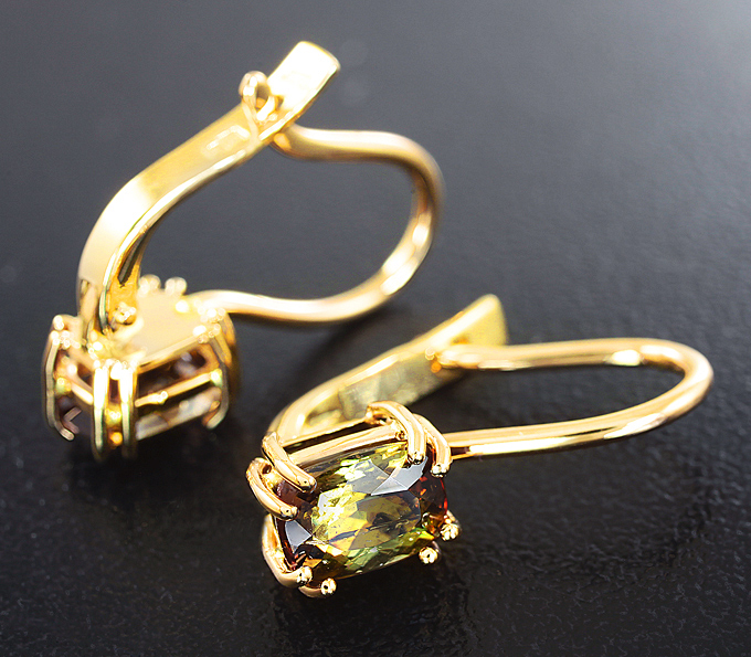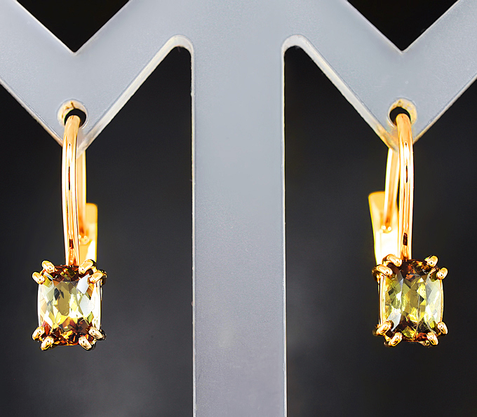 Вашему вниманию предлагаются серьги из желтого золота 585 пробы с андалузитами! Размеры вставок 7 х 5 мм. Размеры серег с петлей 20 х 6 мм. Вес пары 3,2 г.