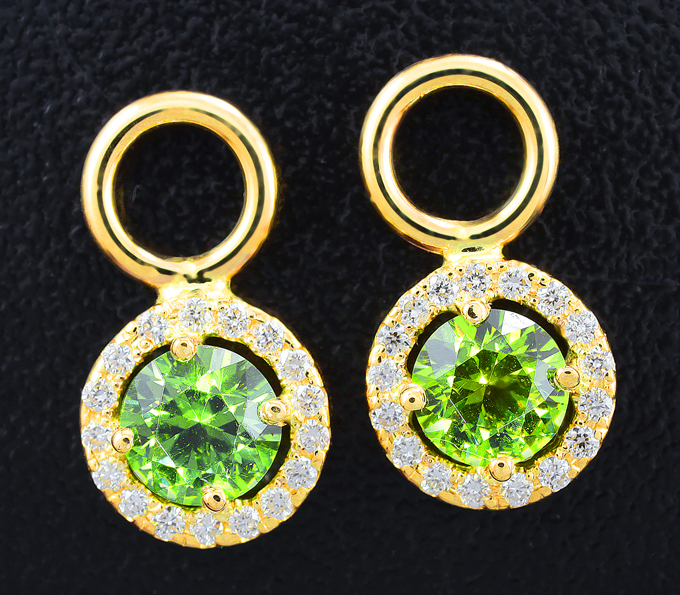 Вашему вниманию предлагаются подвесы для серег из желтого золота 585 пробы с уральскими демантоидами и бриллиантами! Диаметр дополнительной инкрустации 1,1 мм. Размеры подвесов 15 х 8 мм. Вес пары 2,1 г. Ниже приводятся ювелирные характеристики демантоидов.