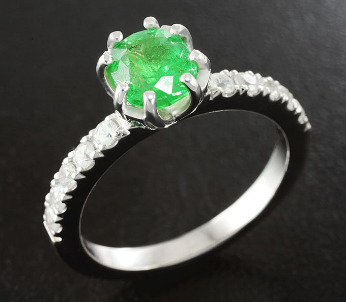 Кольцо c ярким цаворитом гранатом, цирконами и зеленым кубиком циркония