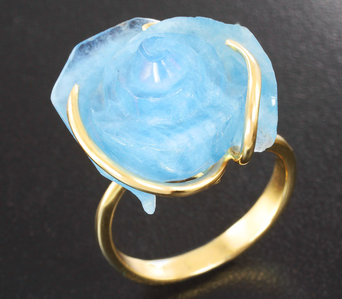 Вашему вниманию предлагается кольцо из желтого золота 585 пробы c резным забайкальским аквамарином! Площадка 19 х 18 мм, высота 15 мм. Вес изделия 7,5 г. Размер 17,75. Ниже приводятся ювелирные характеристики вставки.