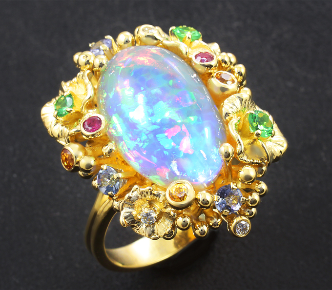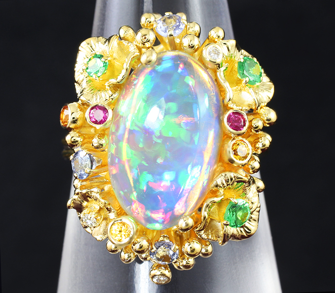Кольцо с кристаллическим эфиопским опалом, цаворитами, танзанитами, желтыми сапфирами, рубинами и бриллиантами