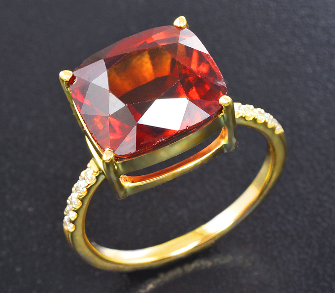 Вашему вниманию предлагается кольцо из желтого золота 585 пробы c гессонитом гранатом и бриллиантами! Диаметр дополнительной инкрустации 1,3 мм. Площадка 21 х 11 мм, высота 8 мм. Вес изделия 4,2 г. Размер 17,5. Ниже приводятся ювелирные характеристики граната.