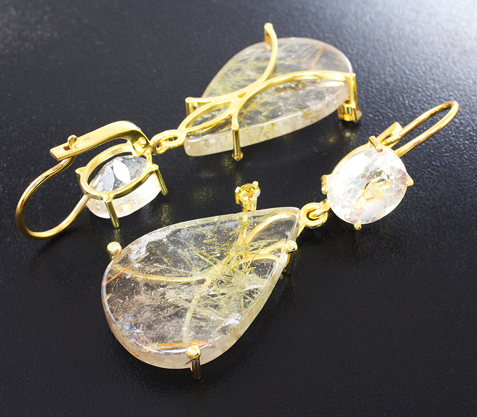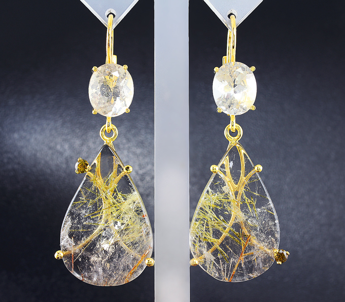 Вашему вниманию предлагаются серьги из стерлингового серебра (925 проба) с кварцем с включением эпидота, бесцветными топазами и уральскими топазолитами высокой дисперсии! Изделие позолочено. Размеры серег с петлей 61 х 22 мм. Вес пары 18,6 г. Ниже приводятся ювелирные характеристики вставок.