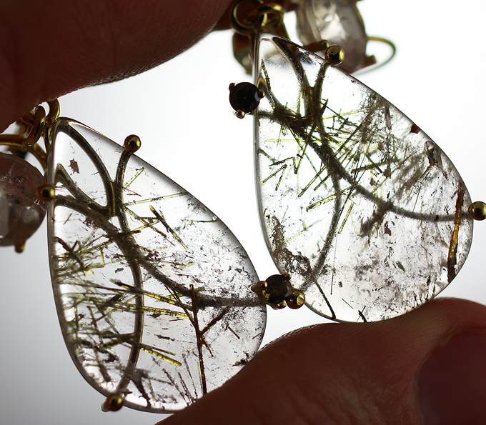 Серьги с кварцем с включением эпидота, топазами и уральскими топазолитами
