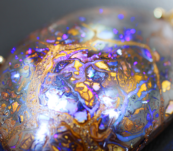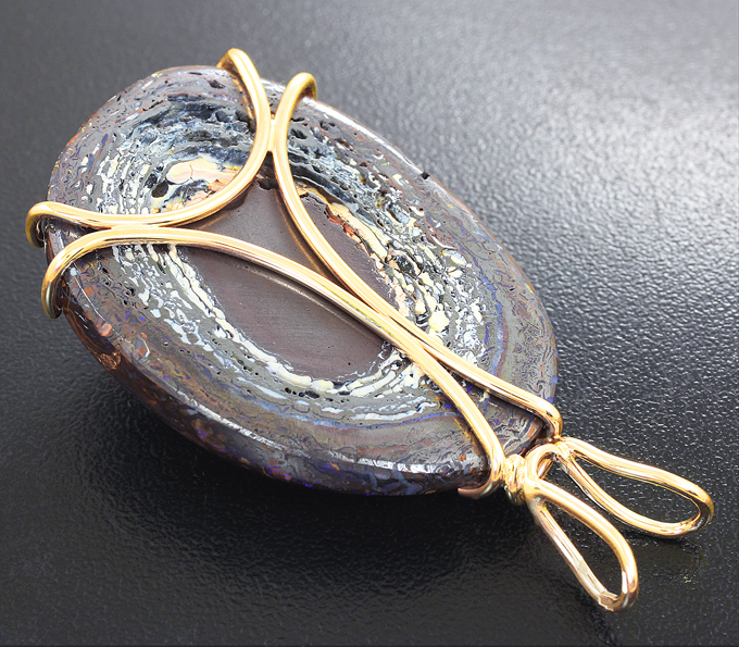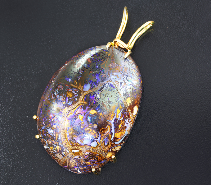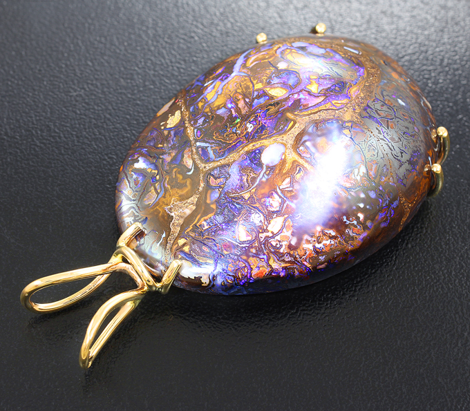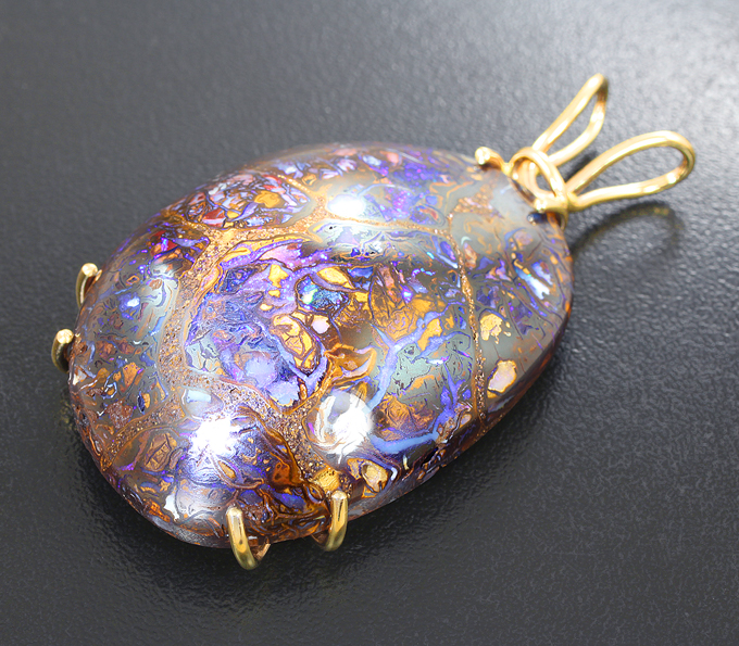 Вашему вниманию предлагается кулон из желтого золота 585 пробы с крупным австралийским болдер опалом! Основные цвета опалесценции: фиолетовый и синий. Размеры вставок 45 х 32 мм. Размеры кулона с петлей 58 х 33 мм. Вес изделия 30,4 г. Ниже приводятся ювелирные характеристики вставки.