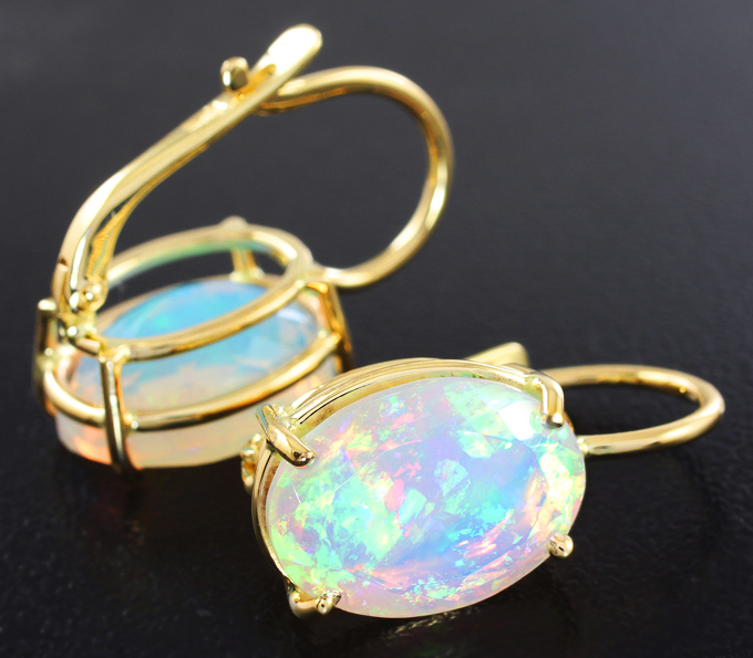 Вашему вниманию предлагаются серьги из желтого золота 585 пробы с крупными ограненными эфиопскими опалами! Основные цвета опалесценции: красный, желтый, зеленый и синий. Размеры серег с петлей 23 х 11 мм. Вес пары 5,2 г. Ниже приводятся ювелирные характеристики вставок.