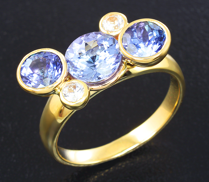 Вашему вниманию предлагается кольцо из желтого золота 585 пробы с танзанитами и лейкосапфирами! Диаметр дополнительной инкрустации 3 мм. Площадка 19 х 10 мм, высота 5 мм. Вес изделия 5 г. Размер 17,5. Ниже приводятся ювелирные характеристики танзанитов.