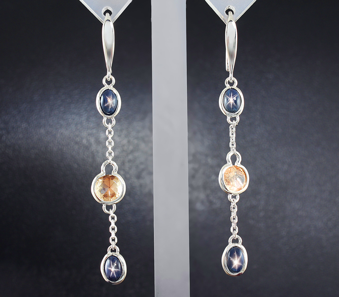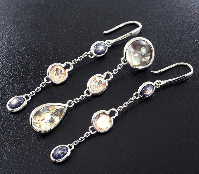 Вашему вниманию предлагается комплект (серьги + кулон) из белого золота 585 пробы с орегонскими солнечными камнями и звездчатыми сапфирами! Вес комплекта 7 г.