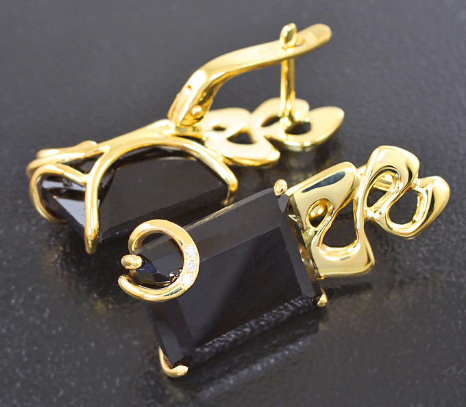 Вашему вниманию предлагаются серьги из желтого золота 585 пробы с черными турмалинами — шерлами и бриллиантами! Диаметр дополнительной инкрустации 1 мм. Размеры серег с петлей 28 х 12 мм. Вес пары 7,9 г. Ниже приводятся ювелирные характеристики турмалинов.