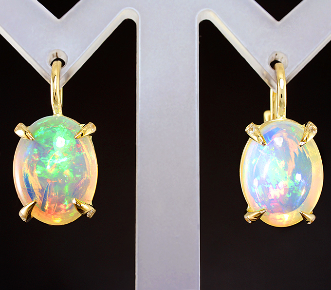Вашему вниманию предлагаются серьги из желтого золота 585 пробы с кристаллическими эфиопскими опалами и бесцветными цирконами! Диаметр дополнительной инкрустации 1,1 мм и 1,2 мм. Основные цвета опалесценции: красный, желтый, зеленый и синий. Размеры серег с петлей 14 х 10 мм. Вес пары 4,34 г. Ниже приводятся ювелирные характеристики опалов.