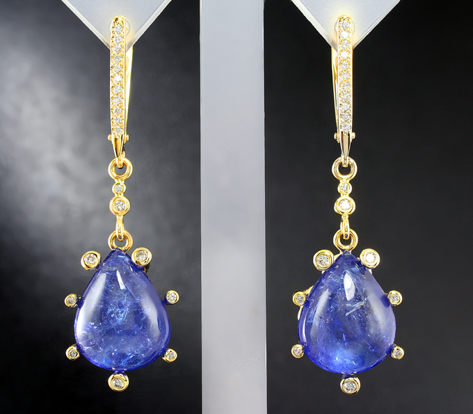 Вашему вниманию предлагаются серьги из желтого золота 585 пробы с танзанитами 25,47 карата и бриллиантами! Размеры танзанитов 15 х 12 мм, диаметр бриллиантов 1,1 мм и 1,5 мм. Размеры серег с петлей 46 х 14 мм. Вес пары 10,74 г.