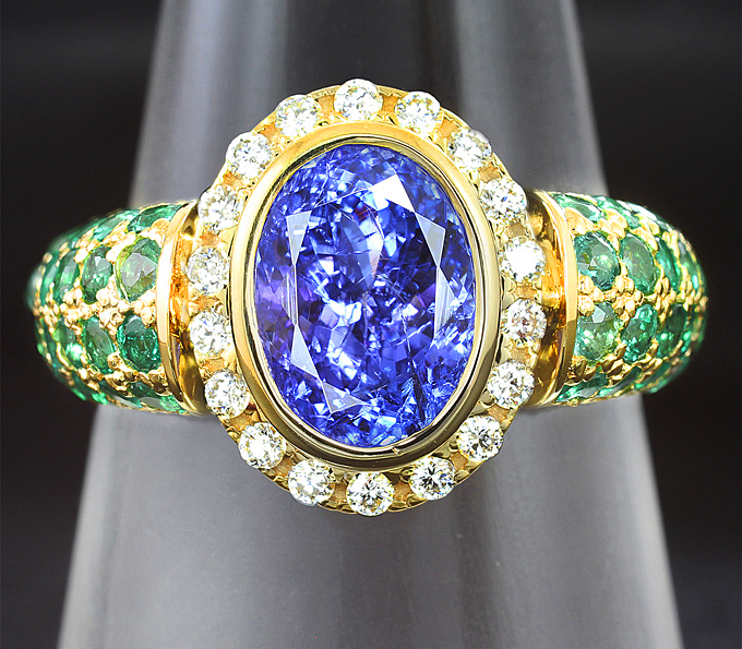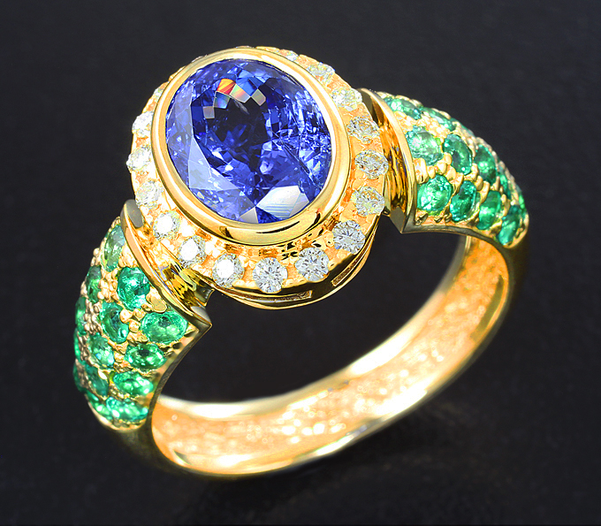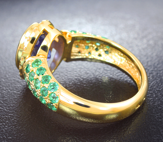 Кольцо с танзанитом 3,18 карата, изумрудами и бриллиантами