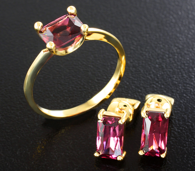 Вашему вниманию предлагается комплект (кольцо + серьги) из желтого золота 585 пробы с родолитами гранатами! Вес комплекта 3,8 г.