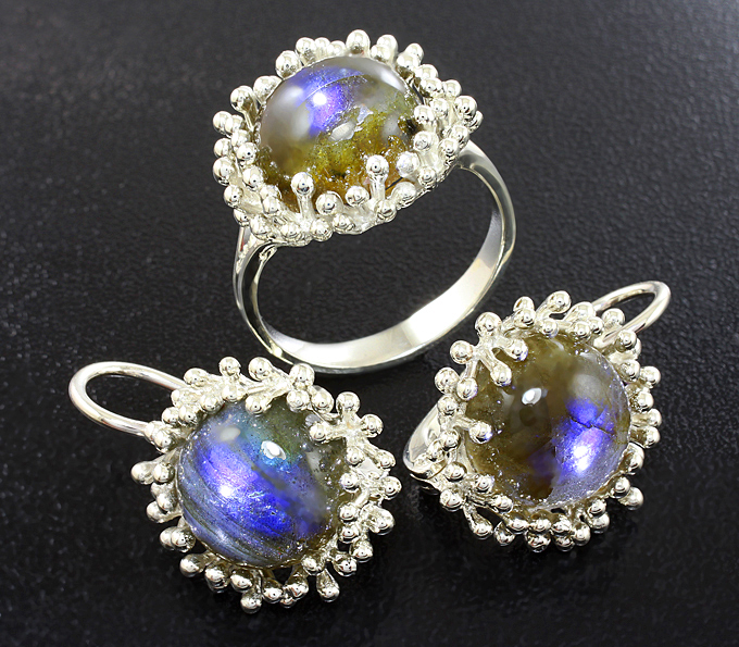 Вашему вниманию предлагается комплект (кольцо + серьги) из стерлингового серебра (925 проба) с лабрадоритами! Вес комплекта 15,3 г.