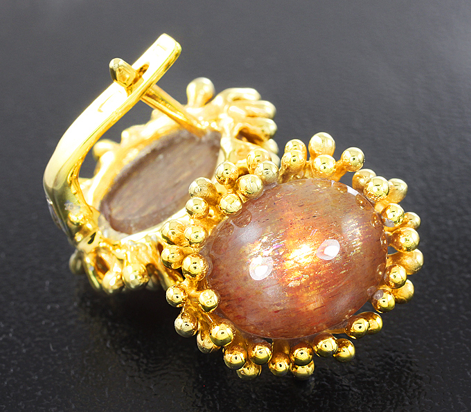 Вашему вниманию предлагается комплект (кольцо + серьги) из стерлингового серебра (925 проба) с солнечными камнями! Изделия позолочены. Вес комплекта 13,2 г.