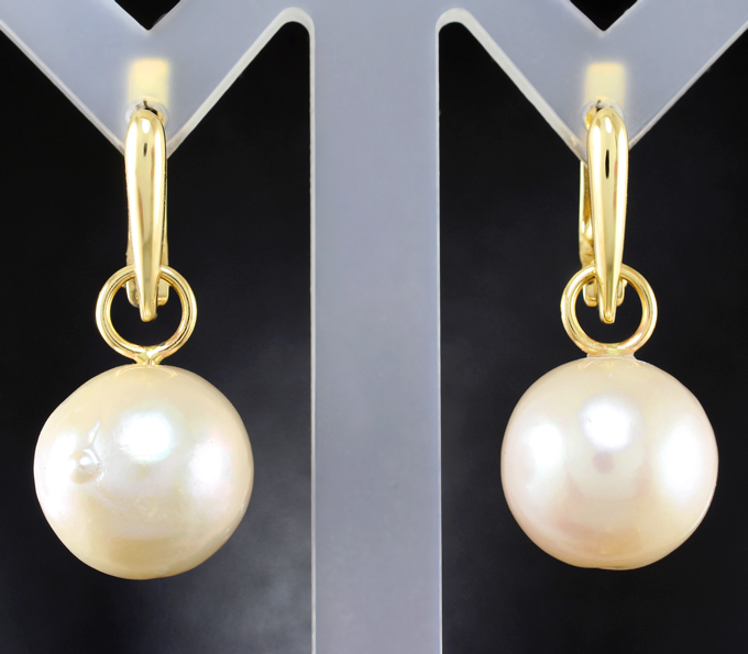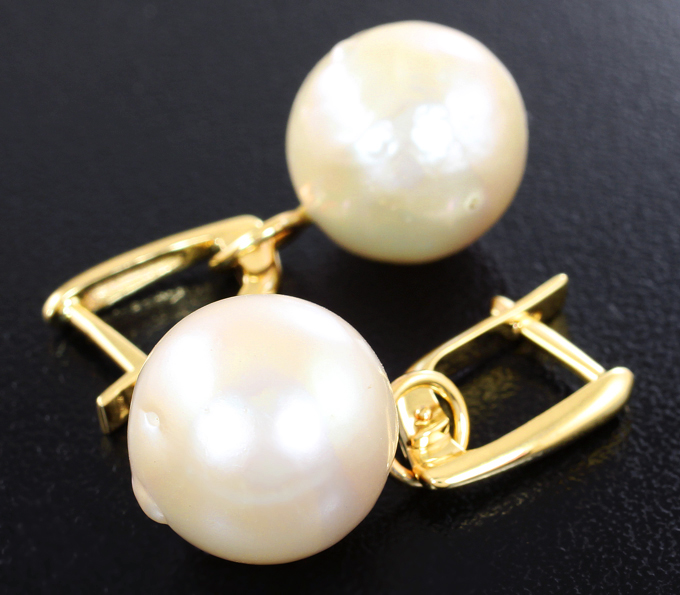 Вашему вниманию предлагаются серьги из желтого золота 585 пробы с крупным морским жемчугом! Съемные швензы! Исключительный люстр! Размеры серег с петлей 28 х 13 мм. Вес пары 8,86 г. Ниже приводятся ювелирные характеристики вставок.