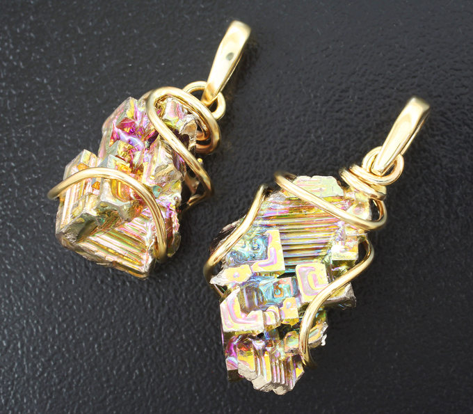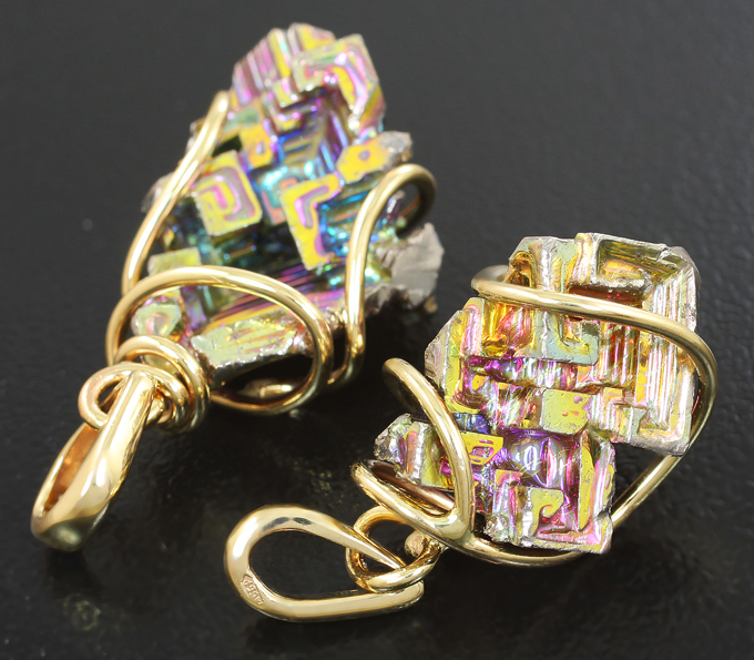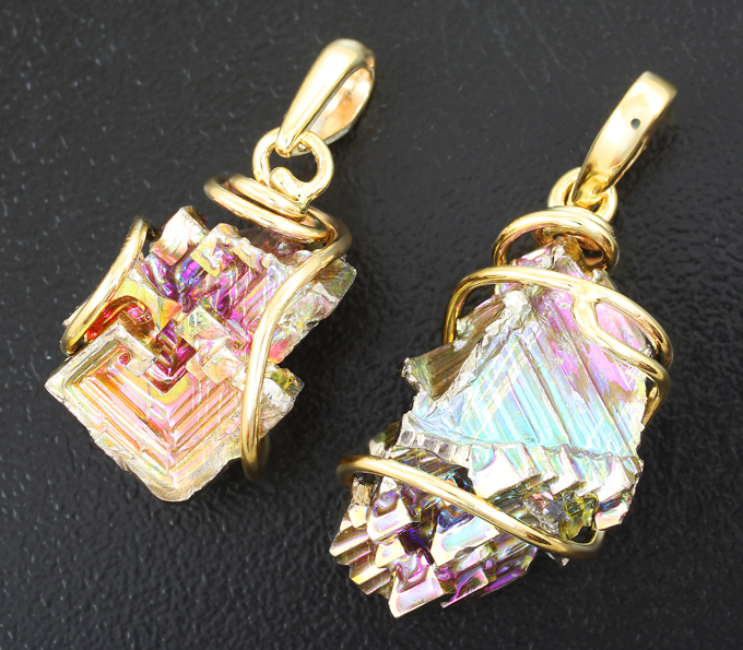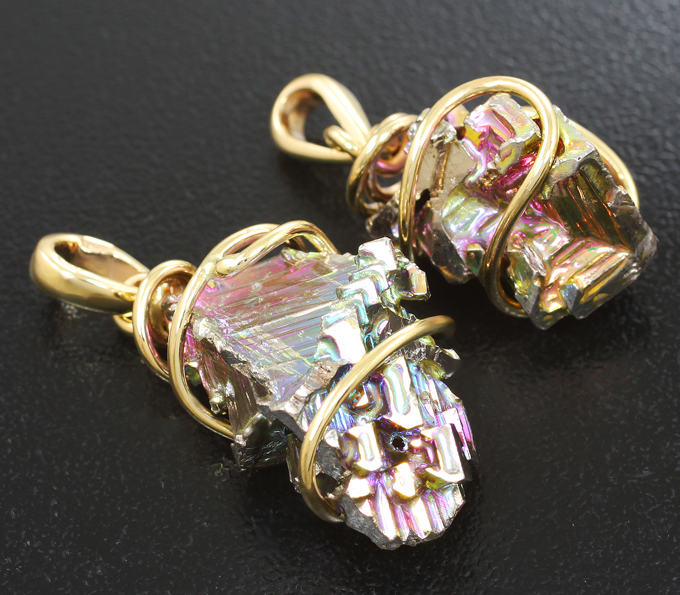 Вашему вниманию предлагается пара кулонов из желтого золота 585 пробы с кристаллами висмута! Размеры кулонов 26 х 13 мм и 31 х 13 мм. Вес изделий 5,6 и 6,5 г. Ниже приводятся ювелирные характеристики вставок.
