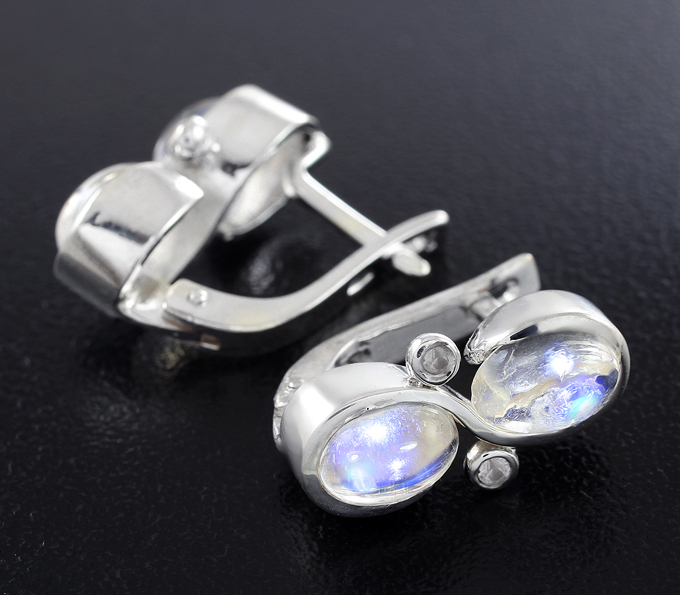 Вашему вниманию предлагается комплект (кольцо + серьги) из стерлингового серебра (925 проба) с лунным камнем и лейкосапфирами! Размеры вставок 1,5 мм и 7 х 5 мм. Вес комплекта 7,9 г.