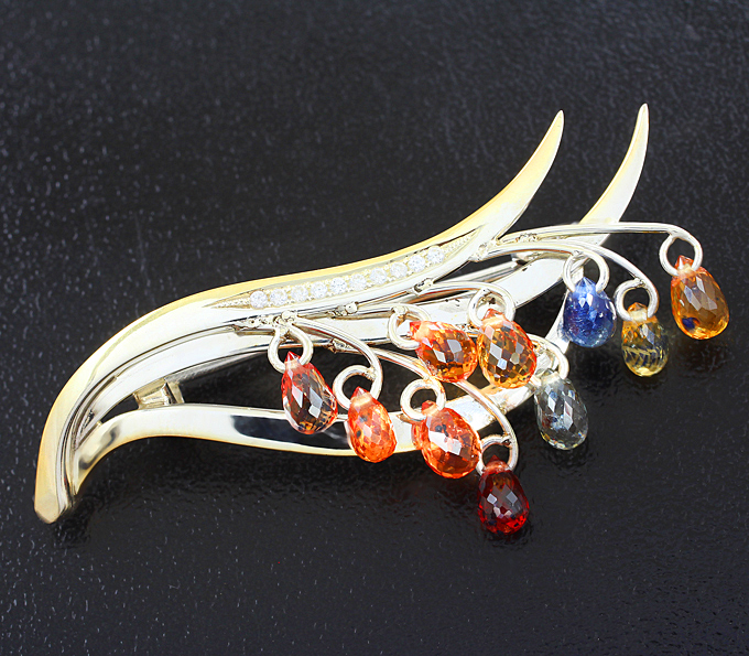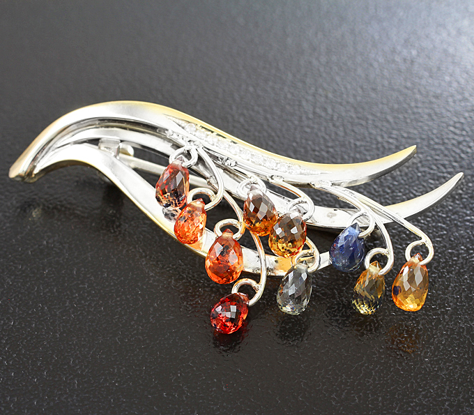 Брошь c бриолетами разноцветных сапфиров и лейкосапфирами