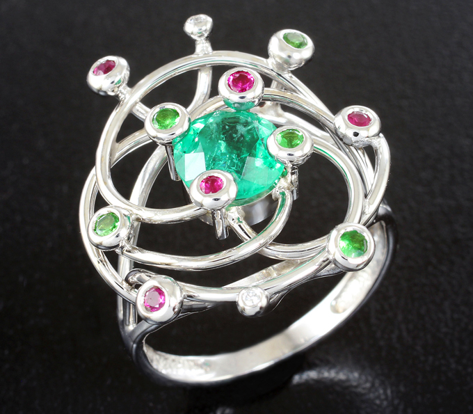 Кольцо с изумрудом 1,42 карата, рубинами, цаворитами гранатами и бриллиантами