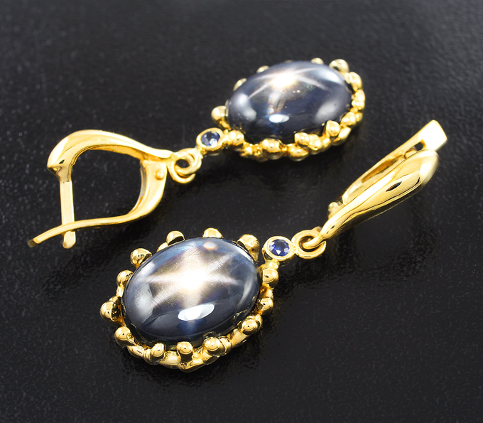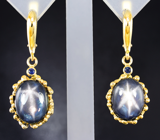 Вашему вниманию предлагаются серьги из желтого золота 585 пробы с крупными звездчатыми и синими сапфирами! Диаметр дополнительной инкрустации 2 мм. Размеры серег с петлей 35 х 13 мм. Вес пары 8,1 г. Ниже приводятся ювелирные характеристики вставок.