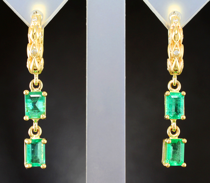Вашему вниманию предлагаются серьги из желтого золота 585 пробы с уральскими изумрудами 1,91 карата и бесцветными цирконами! Размеры вставок 1 мм и 5 х 4 мм. Размеры серег с петлей 30 х 4 мм. Вес пары 3,2 г.