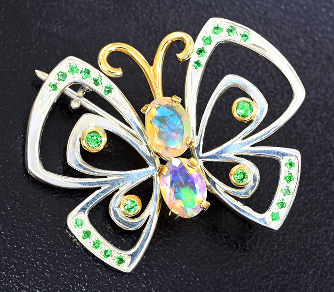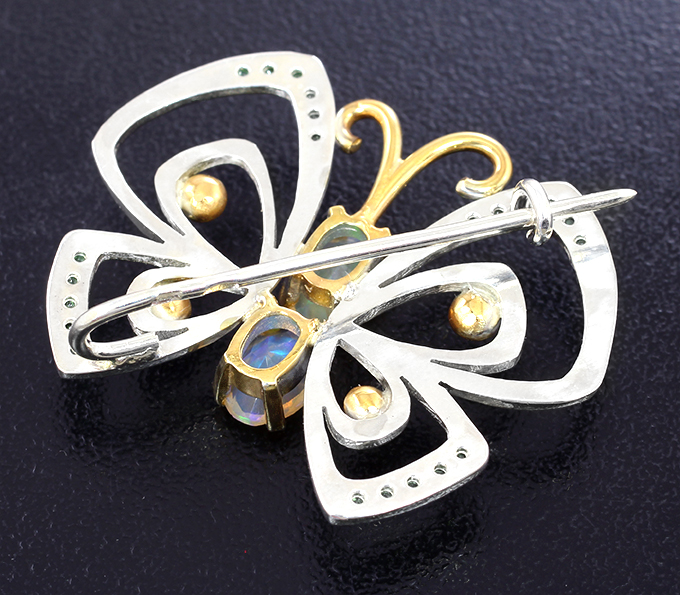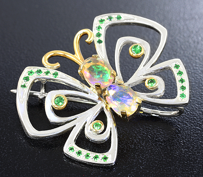 Брошь c ограненными эфиопскими опалами и цаворитами гранатами