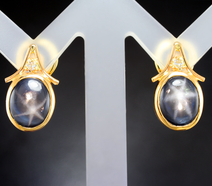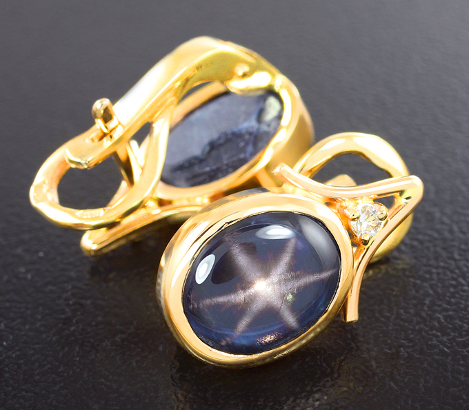 Вашему вниманию предлагаются серьги из желтого золота 585 пробы со звездчатыми и бесцветными сапфирами! Диаметр дополнительной инкрустации 2 мм. Площадка серег 17 х 10 мм. Вес пары 5,8 г. Ниже приводятся ювелирные характеристики кабошонов.