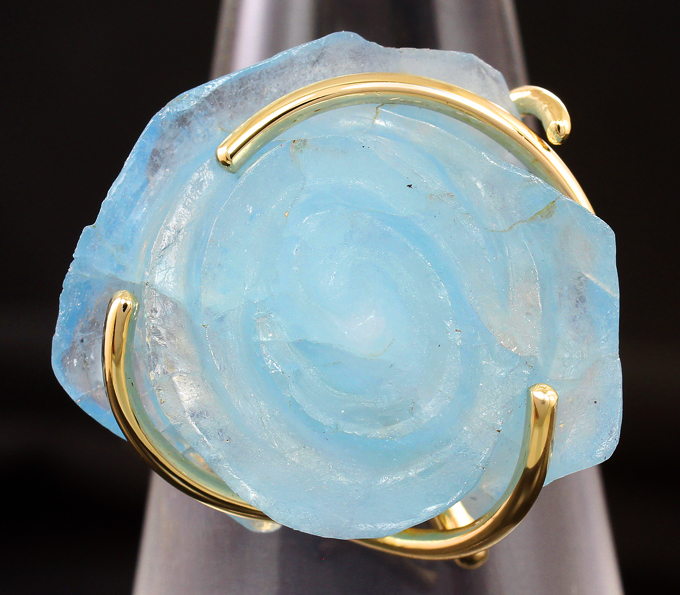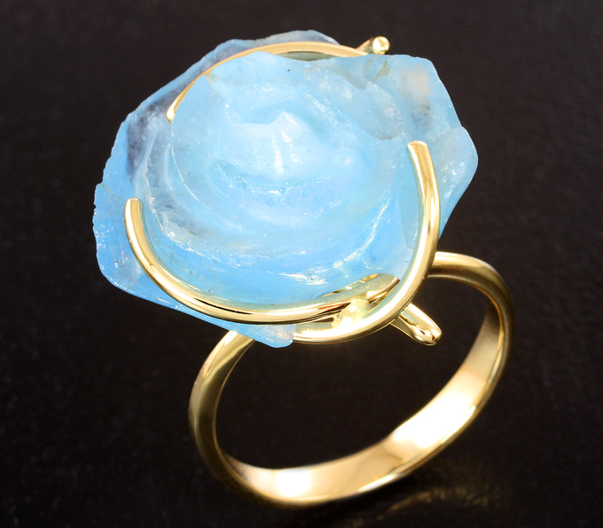 Вашему вниманию предлагается кольцо из желтого золота 585 пробы c резным аквамарином! Площадка 21 х 20 мм, высота 11 мм. Вес изделия 7,2 г. Размер 17,75. Ниже приводятся ювелирные характеристики вставки.
